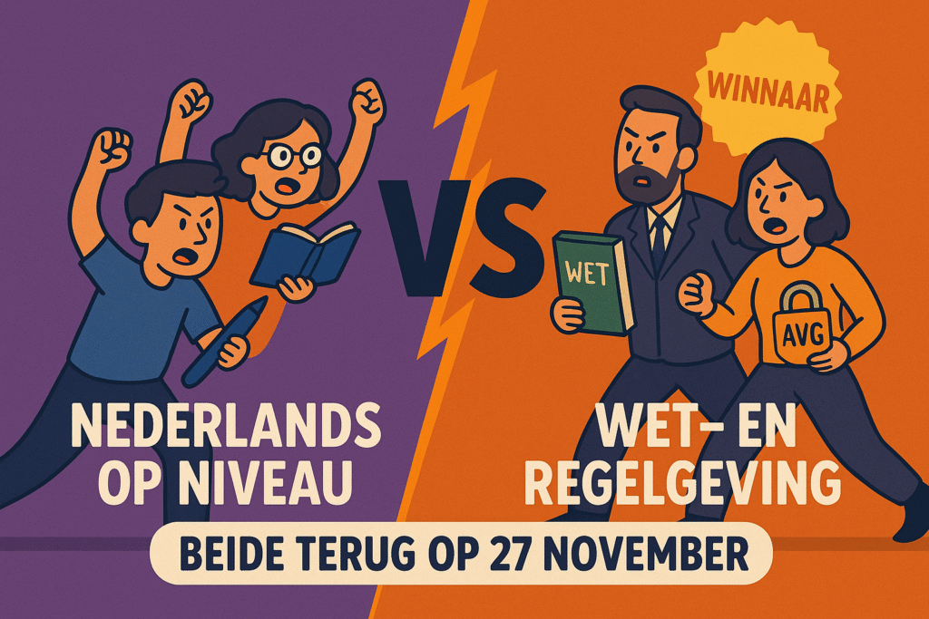 Uiteindelijk trok Wet- en Regelgeving nét aan het langste eind. Veel reacties gingen over hoe pittig beide onderwerpen zijn. Want wie twijfelt er nooit over een d of t? Of over welke gegevens je nu wél of níet mag delen? En hoe lang je iets mag bewaren in je administratie? 😉